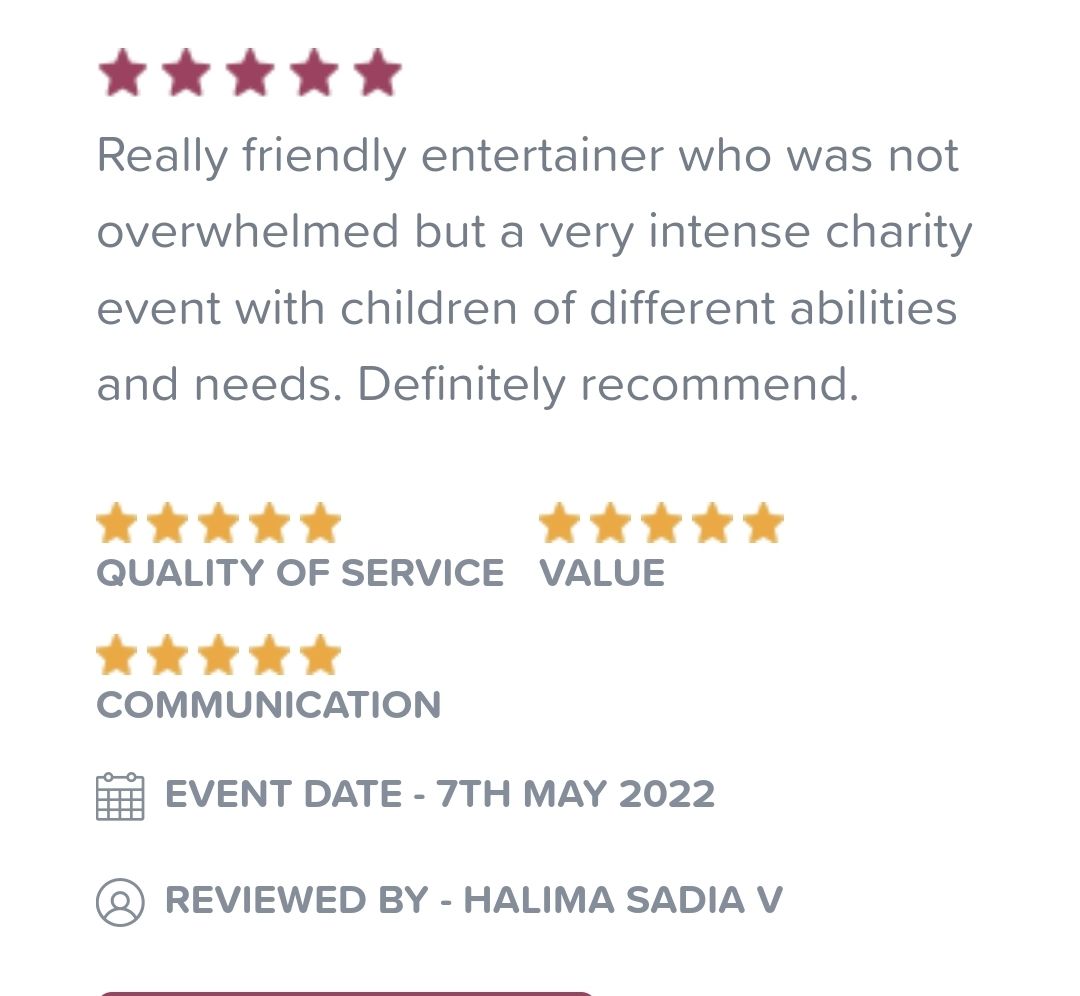 28th May 2022 Roly - thank you so much for today it was wonderful. Such a talent to entertain and control all those children. Jack was telling me all about his magic powers when tucking him in tonight - made money, made a real rabbit, blew up balloons. So pleased with himself! Dr Kirsty Pollard